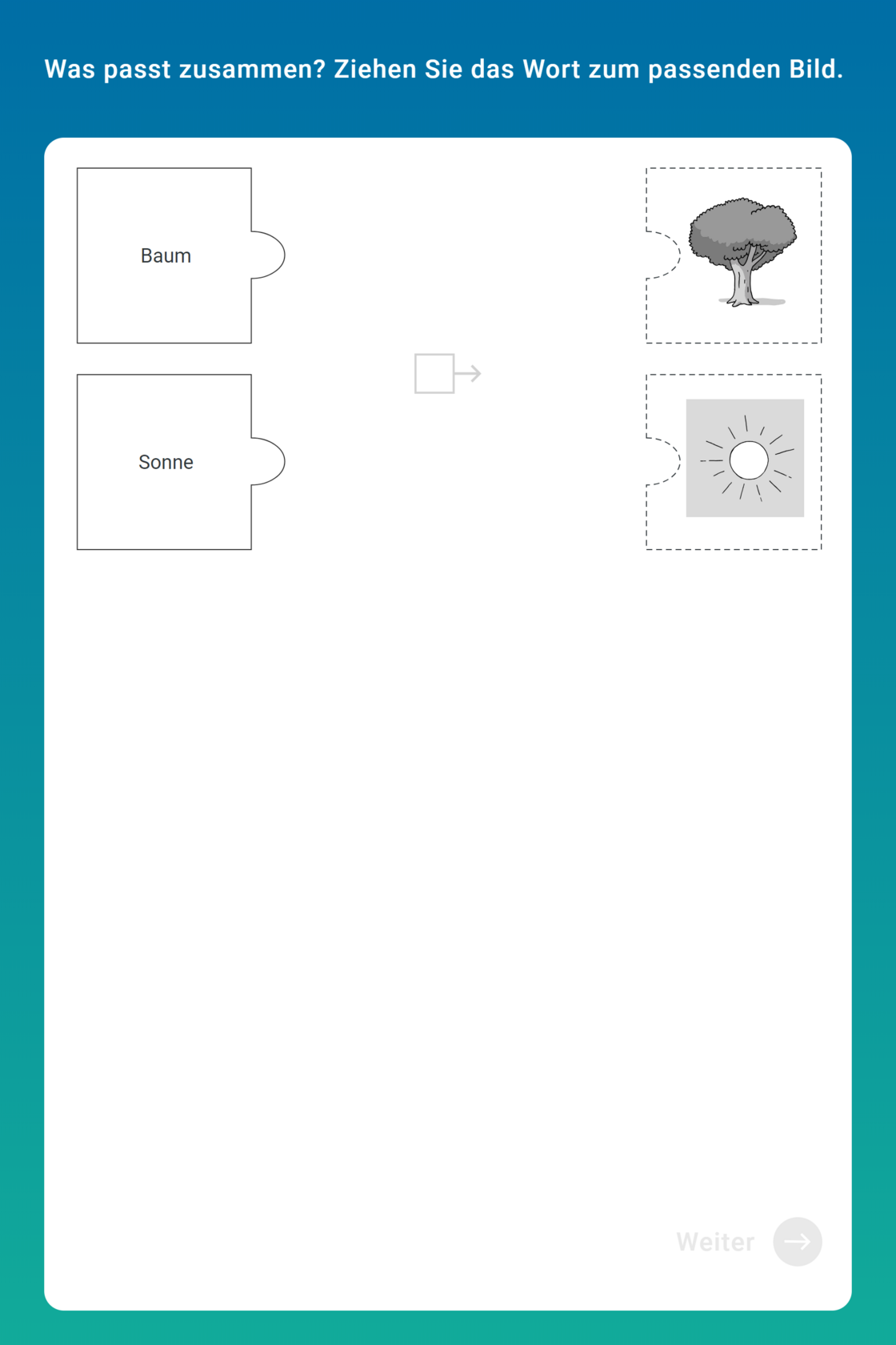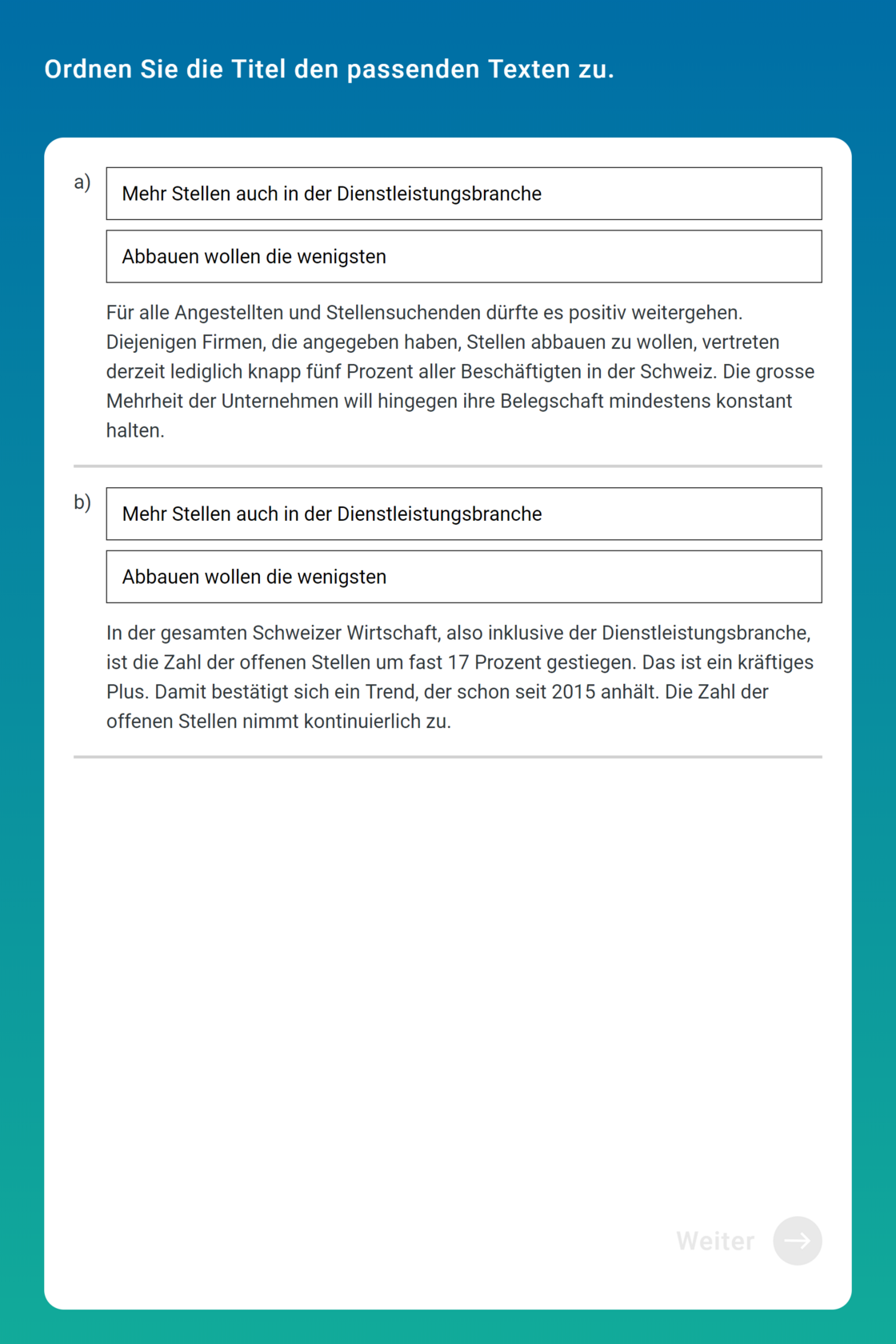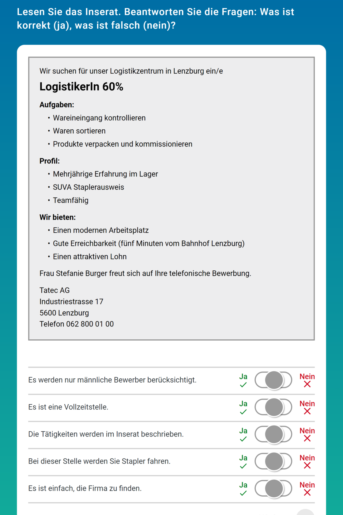 Die Beispielaufgaben unten zeigen in verkürzter und vereinfachter Form, wie die Testaufgaben aussehen können. Die Aufgabenformate variieren und sind je nach GER-Niveau einfacher oder schwieriger.