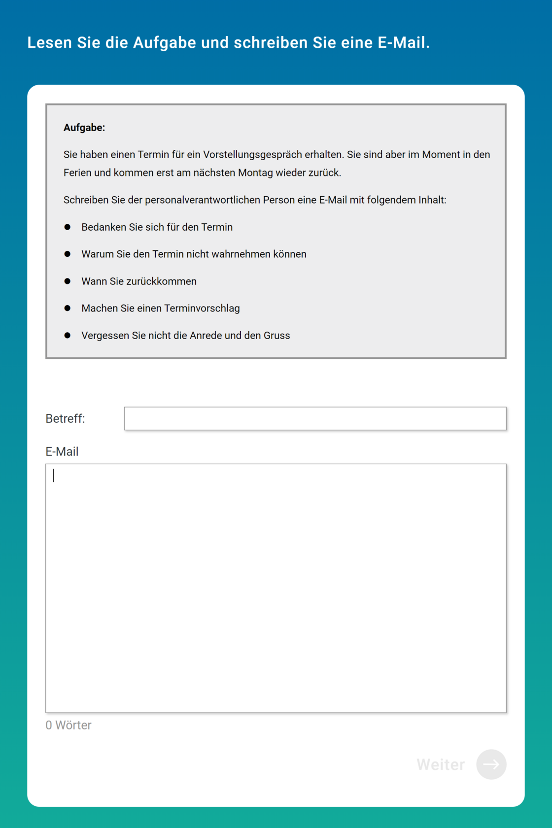 Die produktiven Sprachkompetenzen (Schreiben und Sprechen) werden von der Testleitung bewertet und nicht automatisch korrigiert.