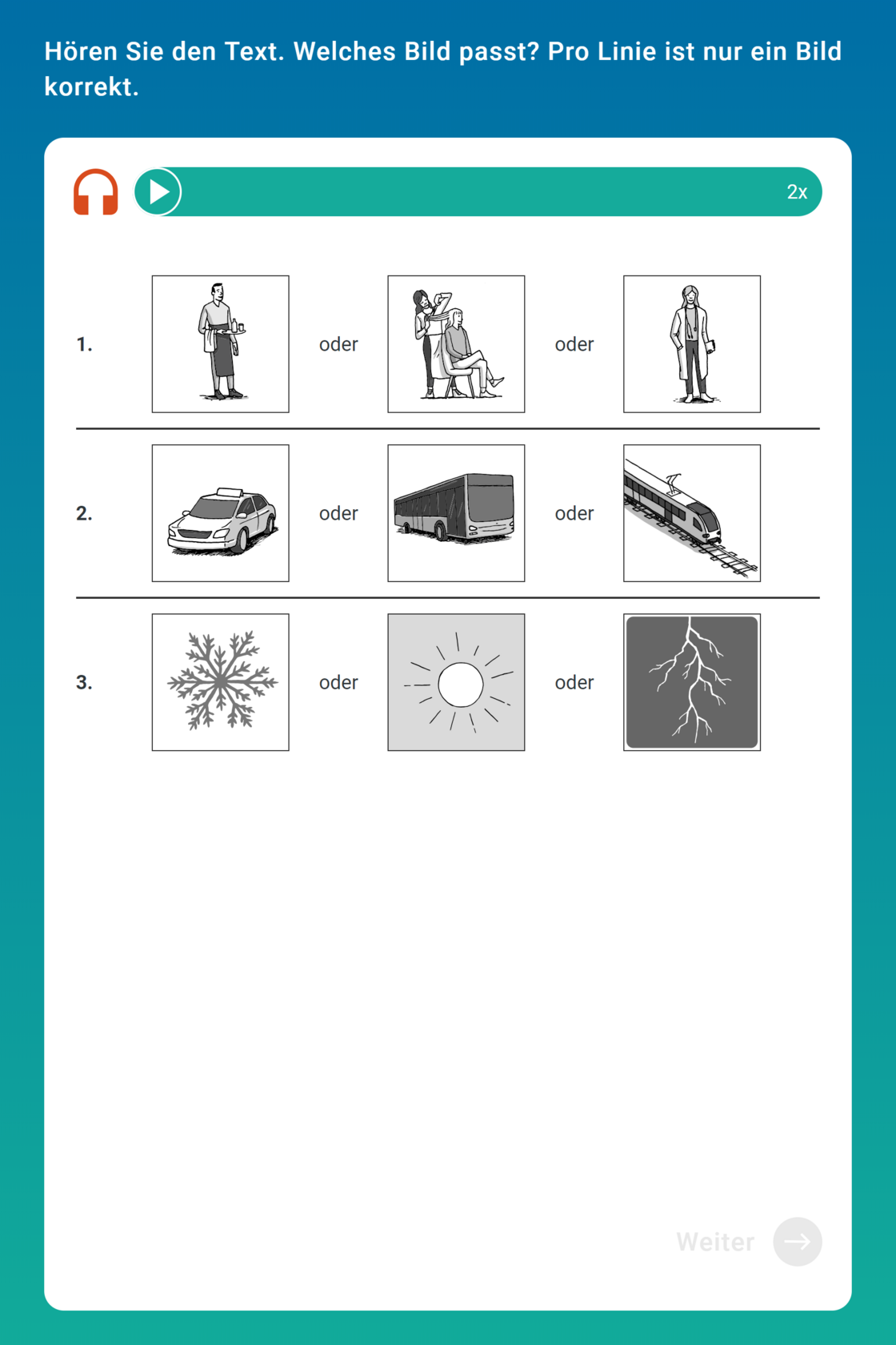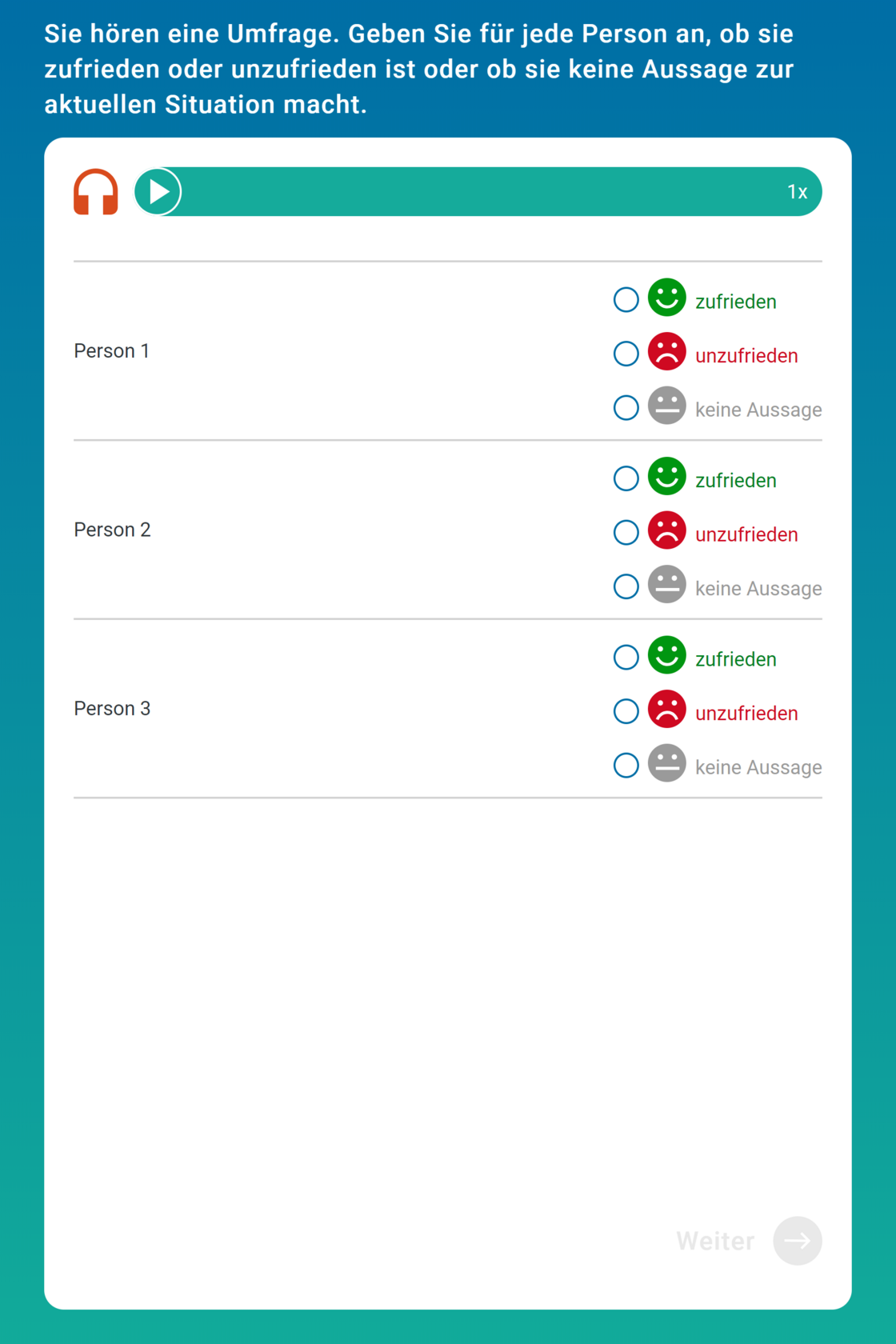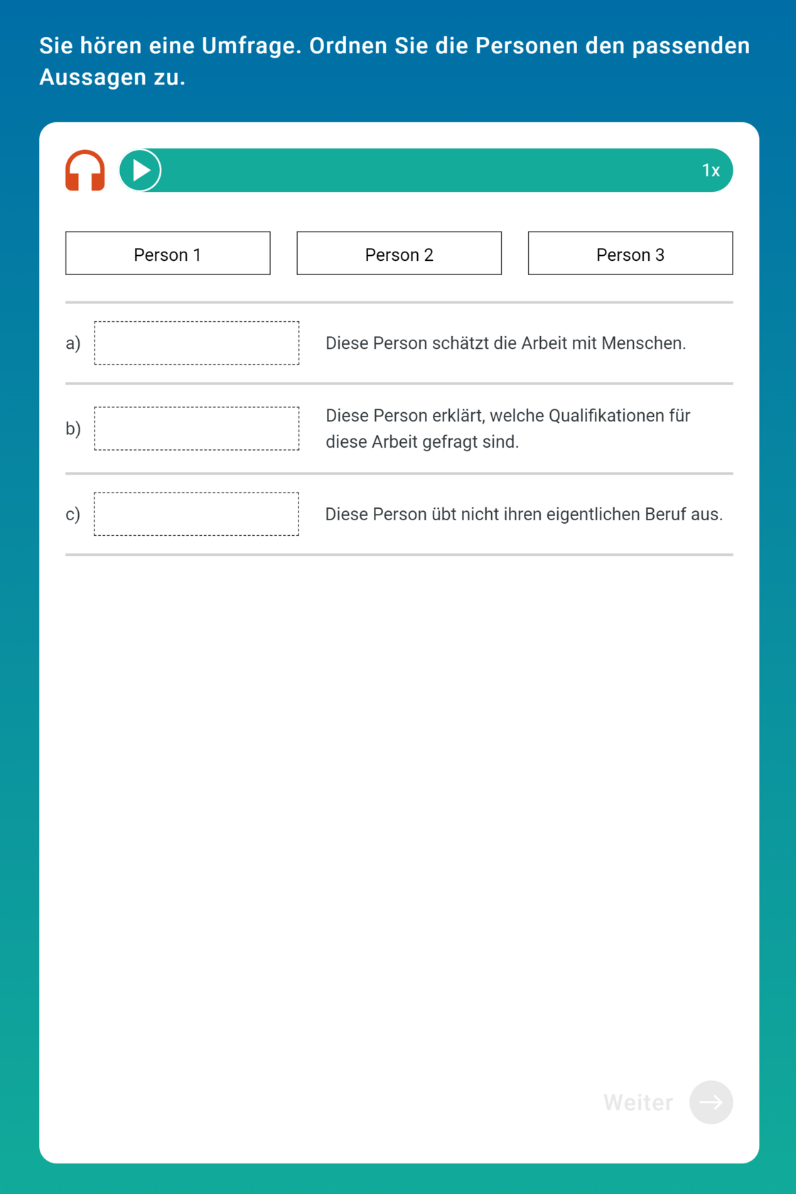Die Sprachhandlungskompetenz Sprechen wird in einem Interview mit der Testleitung geprüft. Dazu absolvieren Sie je nach Niveau eine bis maximal vier Aufgaben wie z.B.: